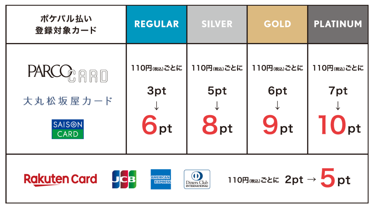 ※The number of PARCO Points awarded varies depending on the credit card registered for PARCO Members Ranked Pokepal Payment.