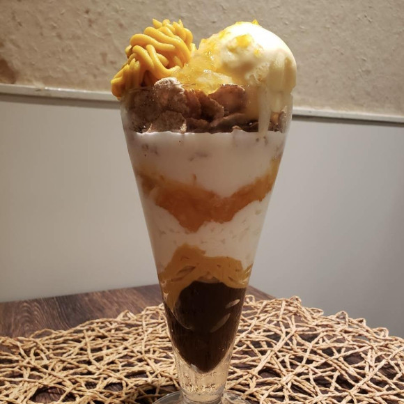 Autumn limited parfait featuring nana's green tea original fragrant homemade hojicha jelly, soft ice cream, brown rice flakes, etc. on a gentle sweetness pumpkin cream using Ebisu pumpkin pumpkin, and topped with homemade sponge cake, vanilla ice cream, Setouchi orange sauce, etc.
