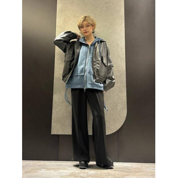 Fake leather with a soft glossy luster and raised suede are used to make the surface attractive. The body has a compact size feel, and it can be worn neatly because it has a sharp silhouette with narrowed hem.
