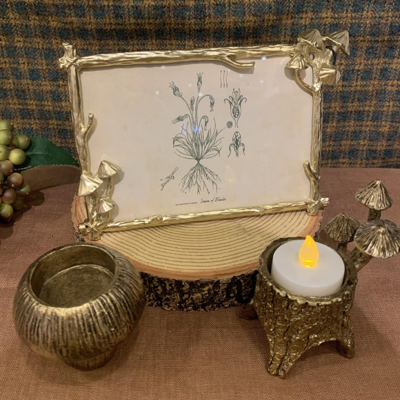 Photo frame with cute mushrooms on the edge. A stump-shaped candle holder with a stump-shaped mushroom and a taste.