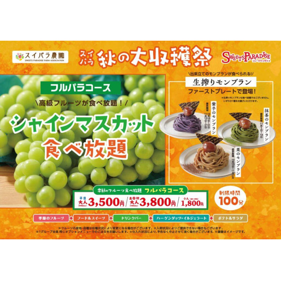 ・We will continue to offer all-you-can-eat autumn reward fruit "Shine Muscat" as well. Please fully enjoy the rich aroma and elegant sweetness.