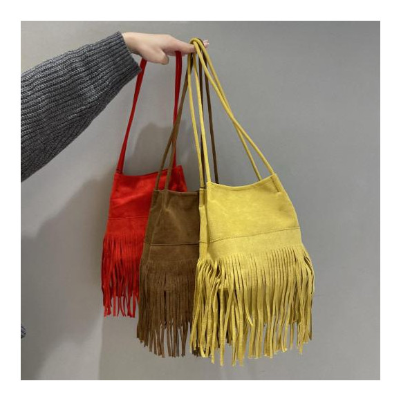 This is an introduction of a shoulder bag decorated with fringes hanging threads and strings on the bag!