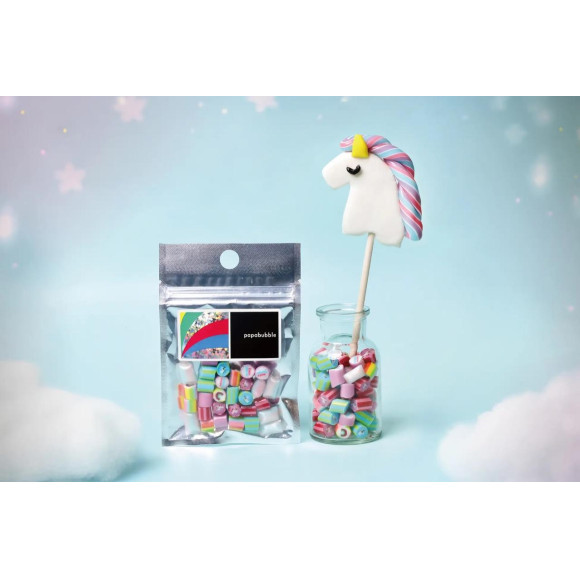 Unicorn Lollipop, which has cute colorful mane, is a unicorn lollipop with a pure white body and a colorful round candy that expresses the mane's mane. Taking advantage of the unique texture of candy, we carefully finished the unicorn-like balance and color by sticking to the three-dimensional modeling of "Tategami = Round Candy". The flavor is a grape flavor popular among a wide range of generations, and it is easy to choose as a gift!