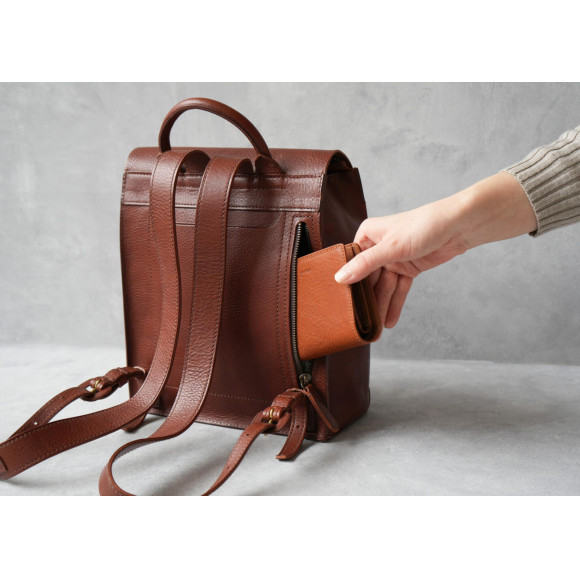 The backpack is equipped with an external fastener on the back, and the functionality that allows you to take out luggage such as wallets without opening the flap is attractive.